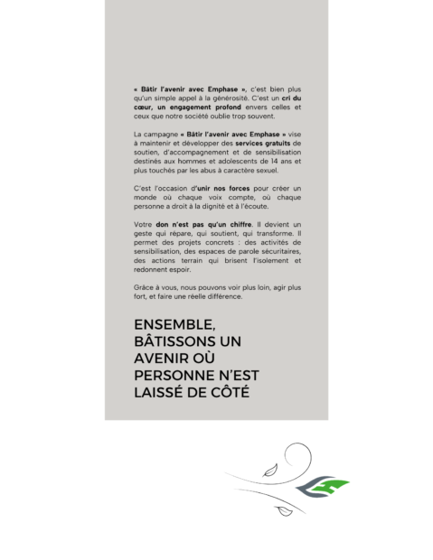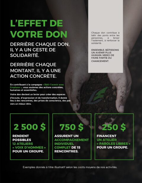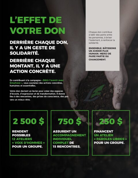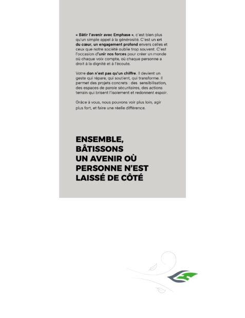 « Bâtir l’avenir avec Emphase », c’est bien plus qu’un simple appel à la générosité. C’est un cri du coeur, un engagement profond envers celles et ceux que notre société oublie trop souvent. C’est l’occasion d’unir nos forces pour créer un monde où chaque voix compte, où chaque personne a droit à la dignité et à l’écoute.