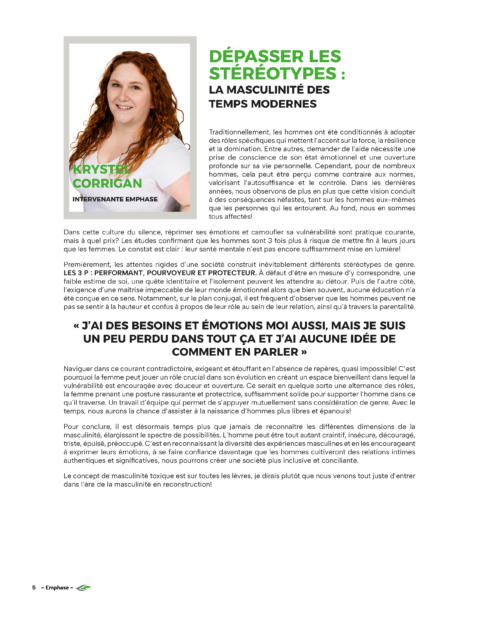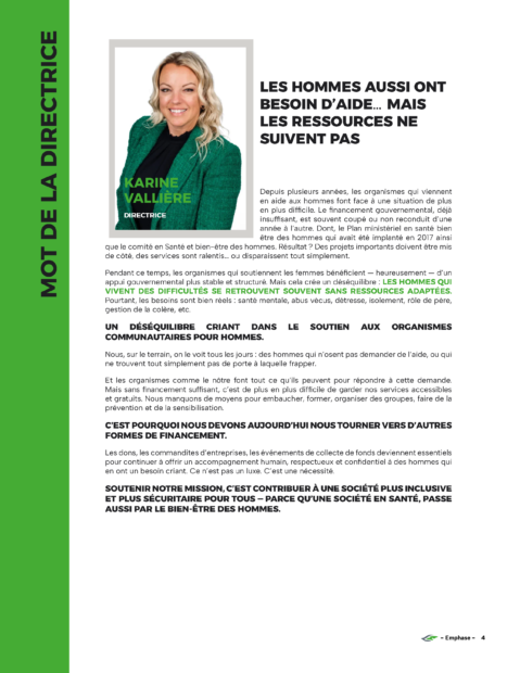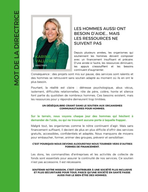 Un organisme à but non lucratif, actif depuis 11 ans, qui améliore le bien-être des hommes et adolescents s’identifiant au genre masculin.