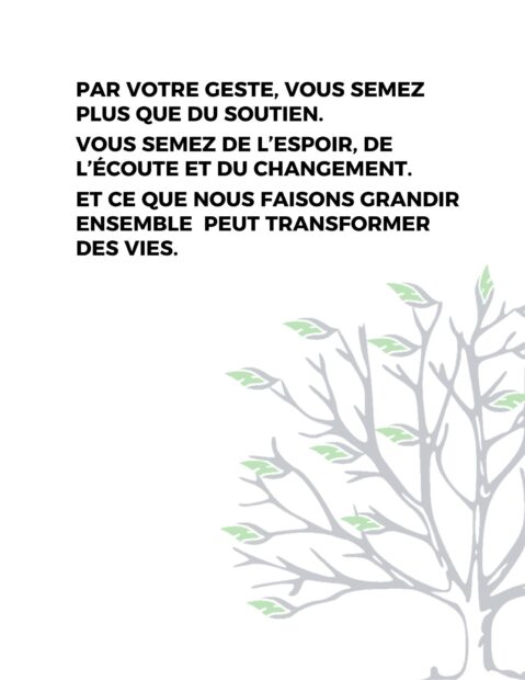 Votre don n’est pas qu’un chiffre. Il devient un geste qui répare, qui soutient, qui transforme. Il permet des projets concrets : des sensibilisation, des espaces de parole sécuritaires, des actions terrain qui brisent l’isolement et redonnent espoir. Grâce à vous, nous pouvons voir plus loin, agir plus fort, et faire une réelle différence.